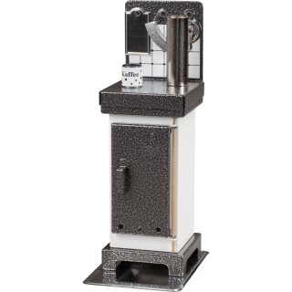 Ein kleiner Küchenherd für die Verwendung von Räucherkerzen mit kleinen Besteckteilen zum Aufhängen an der Fliesenrückwand. Der Rauch der Räucherkerze strömt sowohl aus dem Ofenrohr und aus der Kaffeetasse. In der speziellen Halterung verglimmen die Räucherkerzen vollständig. Nur für Räucherkerzen der Standardgröße geeignet.
